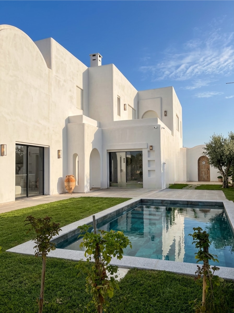 Modern Bali-style villa located in Hammamet, just 5 min from Sindbad Hotel and 5 min by car from the beach. Newly built in 2026, the villa offers a simple and comfortable layout with a nice private pool, 3 suites, and 1 guest toilet. It includes all main amenities such as a dishwasher and washing machine. The property has parking for 2 cars and is set in a very secure and quiet area. It feels calm like the countryside, while being only 700m from the main road and the main theatre of Hammamet.
