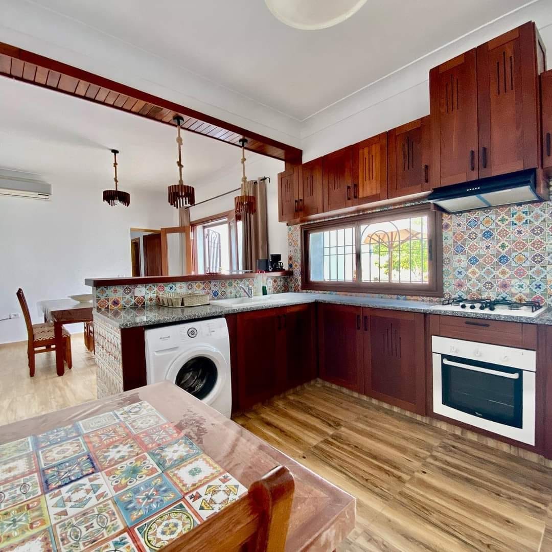 Modern Bali-style villa located in Hammamet, just 5 min from Sindbad Hotel and 5 min by car from the beach. Newly built in 2026, the villa offers a simple and comfortable layout with a nice private pool, 3 suites, and 1 guest toilet. It includes all main amenities such as a dishwasher and washing machine. The property has parking for 2 cars and is set in a very secure and quiet area. It feels calm like the countryside, while being only 700m from the main road and the main theatre of Hammamet.