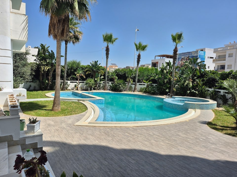 Cet élégant appartement climatisé dispose d'un jacuzzi privatif, situé à seulement 500 mètres de la plage et du port animé, avec ses nombreux restaurants et boutiques, est idéal pour des vacances en famille ou entre amis. Il se trouve aussi à seulement 1km du parc Carthage Land. Il offre 2 chambres avec grands lits doubles et placards, une salle de bain moderne, un salon spacieux, cuisine équipée. Profitez de l'accès à la piscine commune avec transats et barbecue mis à votre disposition.