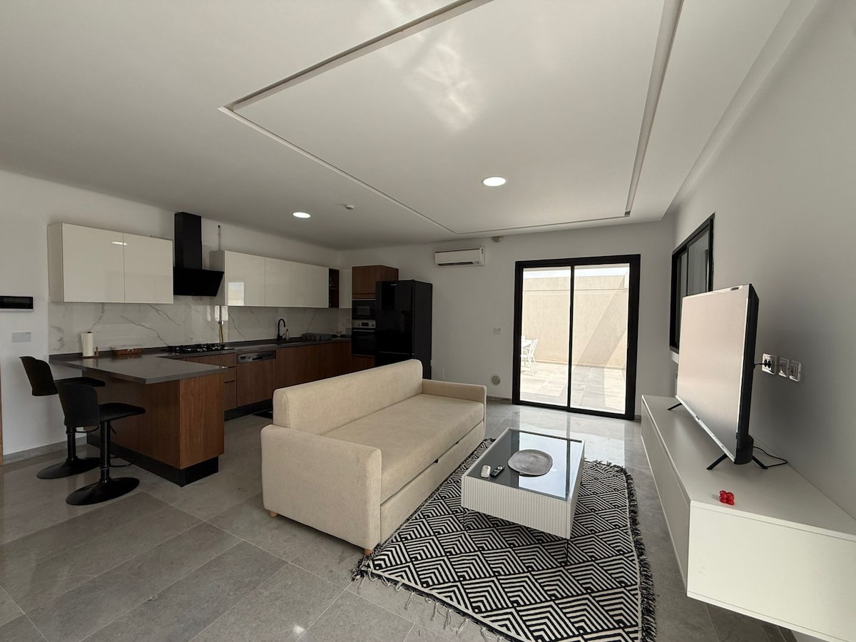 A luxurious 2-bedroom apartment on the 1st floor with an elevator in a quiet residence in Hammamet Nord, just 800 meters away from the beach, a 10-minute walk or a 2-minute drive away. This apartment offers a spacious living room, dining room, fully equipped kitchen, and a large balcony. Close to all amenities (cafes, boutiques, grocery stores, restaurants). 15 minutes drive to Yasmine Hammamet & Nabeul. The residence features a shared swimming pool. Assigned a parking space and 24/7 security.