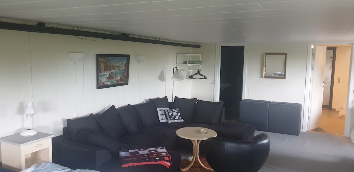 Gæstehus direkte til havet i lille fiskerleje. Indeholder entre, toilet og bad, stue-spiseplads-køkken, hems med dobbeltseng. Dobbelt sovesofa i stue. Vaskemaskine. Parkering tæt ved. Gå afstand til Jons Kapel. Unik beliggenhed. Der er gode muligheder for løb, mtb, kajak og fiskeri. Altsammen lige uden for døren. Bemærk: Gæster udover 2 personer - tillæg kr. 200/dag