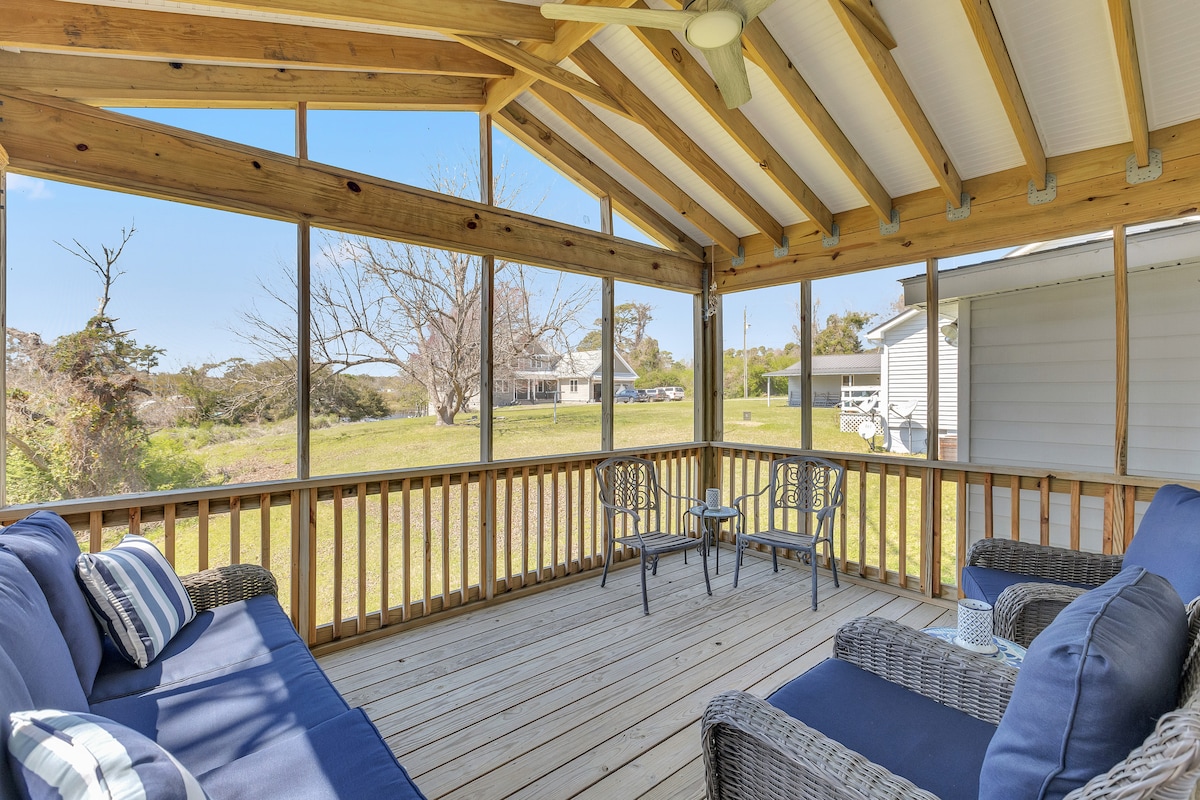 This coastal cottage located in beautiful Cape Carteret sits in a quaint waterfront neighborhood just a short distance to Emerald Isle beaches, local dining and entertainment. Bring your boat, jet skis, bikes or golf cart—there’s plenty of room in the driveway! All modern amenities are offered, including: -Paved parking -Porch with built-in furniture -Newly renovated kitchen stocked with cookware -Washer and Dryer -Dishwasher -Fast Wi-Fi -AppleTVs with YouTube TV