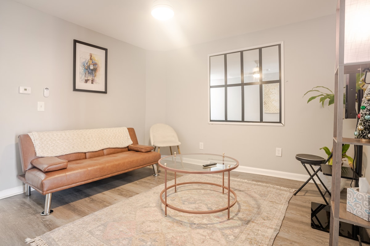 Welcome to your stylish, sun-filled, private basement apartment in Towson, MD! Unwind in a queen-sized bed, enjoy a spa-like rain shower, and cook meals in the fully equipped kitchenette with a microwave, Keurig, air fryer, and portable cooktop. Stream your favorite shows on the 43" Smart TV or work remotely with high-speed WiFi. Guests enjoy free street parking, private entrance, and a shared washer/dryer on-site, making it easy to settle in and feel right at home.