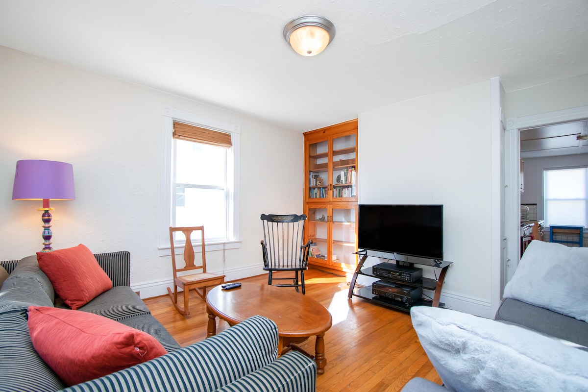 Sun-drenched, recently renovated 2nd floor apartment in gracious 4-family Victorian home, steps from Northampton's vibrant downtown. Wonderful open living/dining/kitchen space w wood floors, lots of comfy couch seating, 65" 4K TV, stainless-steel appliances, butcher block counters. Master BR with queen bed, 55" 4K TV, 2nd BR with double bed. Comfy queen blow-up mattress can be set up in LR. Updated bathroom with shower and tiled floor. Washer and dryer in basement (shared with another apt).