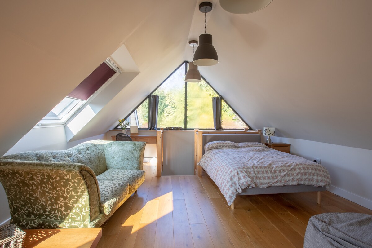 A self-contained studio flat on the first floor of an oak-framed barn in the heart of Owslebury village, a stone’s throw from The Ship pub. It has a kitchen and dining area, bathroom with shower, and a living space with a large double, or twin beds. The kitchen includes a two-ringed hob, fridge, combi-microwave,kettle, coffee machine and toaster. There is off-road private parking just outside the property. EV charger - 22kW type 2 - available on request (extra charge for electricity used).