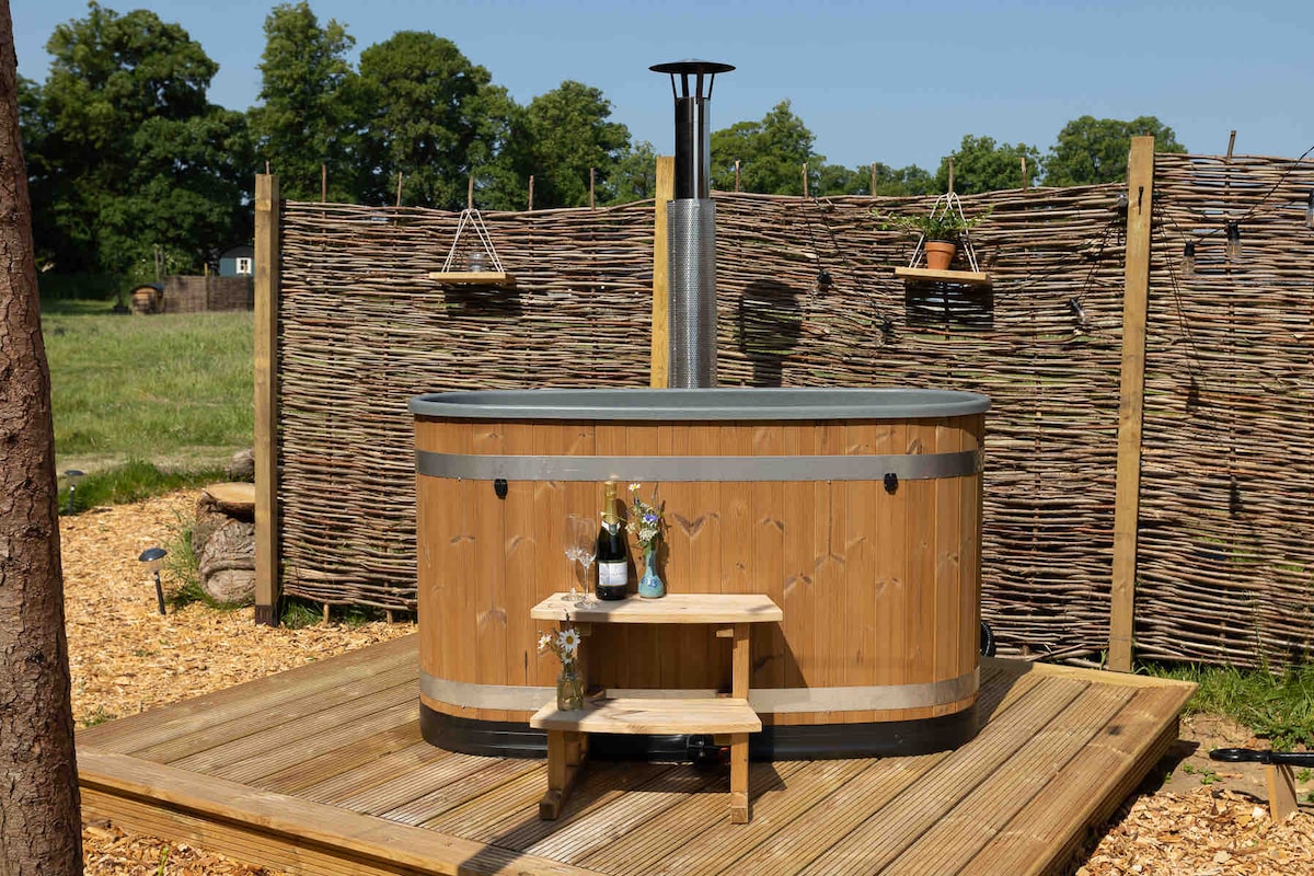 'Nuthatch' shepherd's hut is nestled in the peaceful surroundings of Summerdown Estate. One of a small cluster of four cosy shepherd's huts, ready for you to relax and unwind, surrounded by nature. A stay at Nuthatch hut includes the exclusive use of: Private wood-fired hot tub in its own private outdoor setting. Outdoor seating, firepit and BBQ it’s a beautiful spot to rest and relax. Wood burner & cosy interior Secluded setting in rural Hampshire Perfect for couples & special occasions