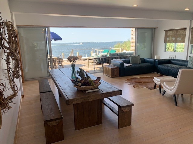 This charming waterfront home is the ideal getaway for the active family with the Hamptons' largest natural 'saline pool' (the Peconic Bay) just footsteps away. This home easily sleeps 7 - with 3 bedrooms and 3 separate kids' sleeping cabins. You can jump on our standup paddle board right off our private dock, jog along wide stretches of pebble beach, have a swim race to our floating swim platform or simply relax in the hammock. 2 bathrooms indoors and 1 private outdoor shower,