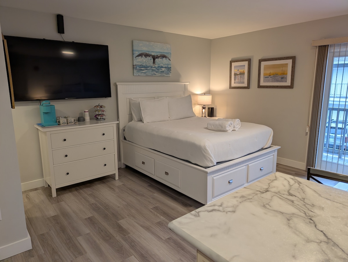 A charming corner unit nestled directly across from the beach. Recently refurbished and tastefully furnished, this cozy studio promises a peaceful retreat mere steps from the lively ambiance of the beachfront. Indulge in comfort with a queen bed, perfect for a couple or 2 friends looking to enjoy some time at the beach. Boasting a coveted location on Ocean Blvd, you're just a short 10 min stroll away from an array of entertainment, shops, and dining options that define Hampton 175 Sq Feet Unit