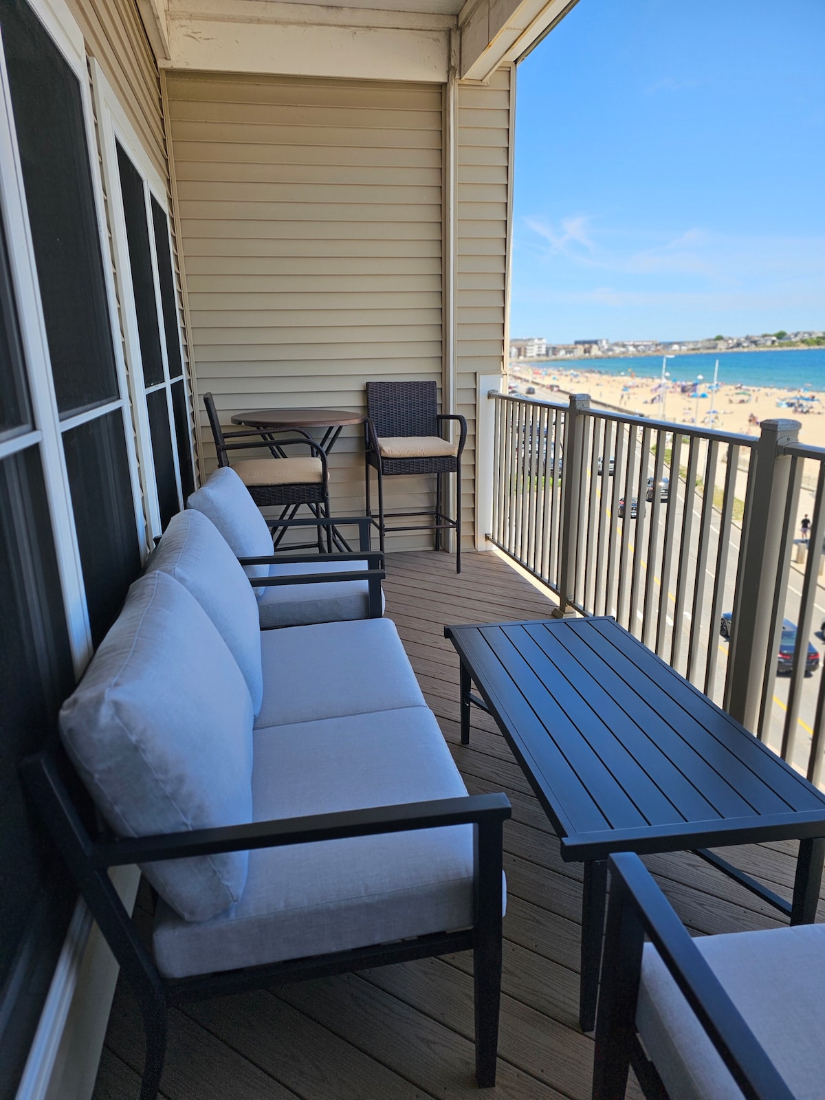 Welcome to Sea Forever. This dreamy little ocean front studio condo has everything you need for your stay at the beach. Amazing views!! Fully equipped kitchenette, full bath, studio size sofa, 2 relaxing chairs, Queen size bed ,TV, cooler, & 2 beach chairs. Wall AC unit. Walk across the street to the beach or 5 minutes to the Hampton Beach Strip for shows, restaurants & stores. Watch the fireworks from your balcony. This is a 3rd floor unit with NO ELEVATOR. The stairs are worth every step!!!