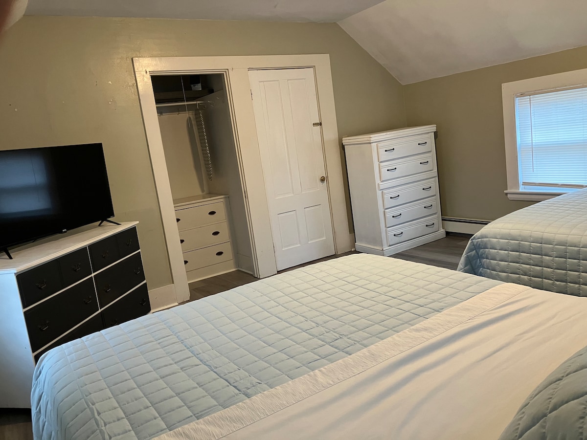 Your family will be close to everything when you stay at this centrally-located Antique New England getaway . Recently renovated, but tastefully original. Everything you need is within walking distance; shopping, grocery, dining, lake, short drive/ride to beach. The space is about 900sqft; 1 bathroom, king bedroom, queen bedroom, queen pull-out couch, and an additional room in which a twin bed can be put (upon request). It will comfortably hold 4 adults, but will accommodate up to 7.