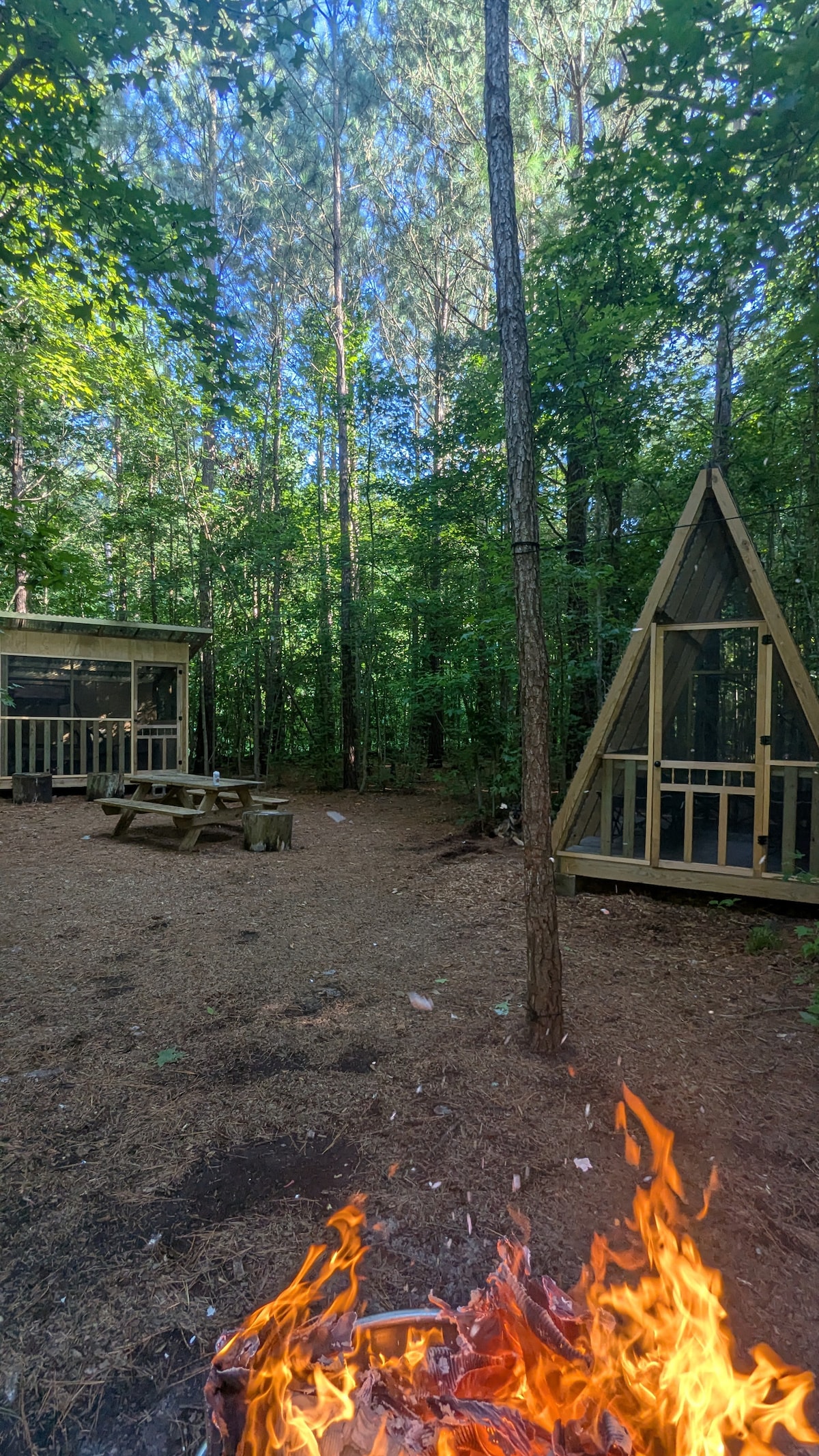 Pet-friendly log cabin with 2 rooms, A/C & heat, free Wi-Fi, and cable TV. Includes a queen bed, breakfast bar, mini-fridge, microwave, and ceiling fan. No bathroom inside, but just steps from our first-class, professionally cleaned bathhouse. No kitchen. Outside: charcoal grill, picnic table, and fire ring. $20 per pet per stay. Linens/pillows not included—bring your own or rent a set for $20. Enjoy our 85° heated pool, free game room, and playground.