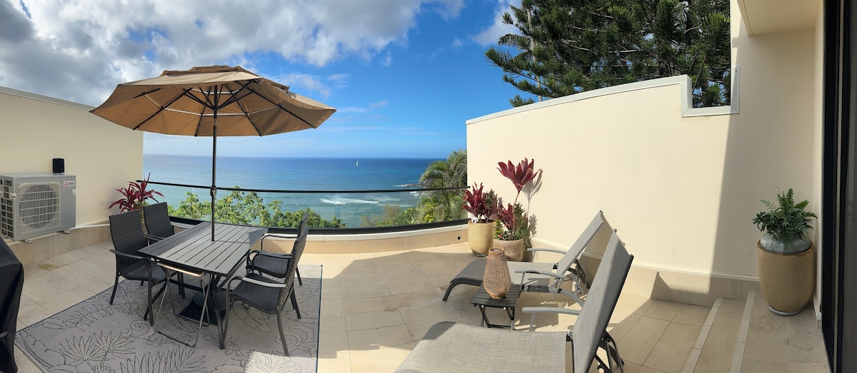Reimagined 2 Bdrm 2 Ba penthouse atop quiet cliff, looking over Anini Reef. Hale Mōlī is our paradise away from home, thoughtfully curated w/ furniture & design for luxury at the beach. Designed to bring the nature surrounding into the unit, sounds of ocean fill the space. F5 at Sealodge, a secluded cliff in Princeville has a private entrance & views in every room. Corner unit with AC+ beach trail. Enjoy sunset over Bali Hai, relax on lanai. Great location w/ easy access to all of North Shore.