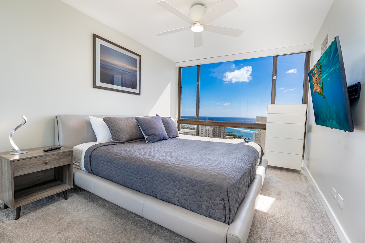 Your dream Vacation to Waikiki, Hawaii is about to begin! Wake up to amazing ocean view from our 26th floor, completely remodeled beautiful studio. Everything is brand new in this cozy comfortable sweet home. Then, after a day of adventuring in the world-famous island O'ahu, come back to a comfortable brand new queen bed, modern kitchen with a big refrigerator and induction cook top, a coffee & tea station to relax and unwind. This is your vacation to enjoy, and we can't wait to host you.
