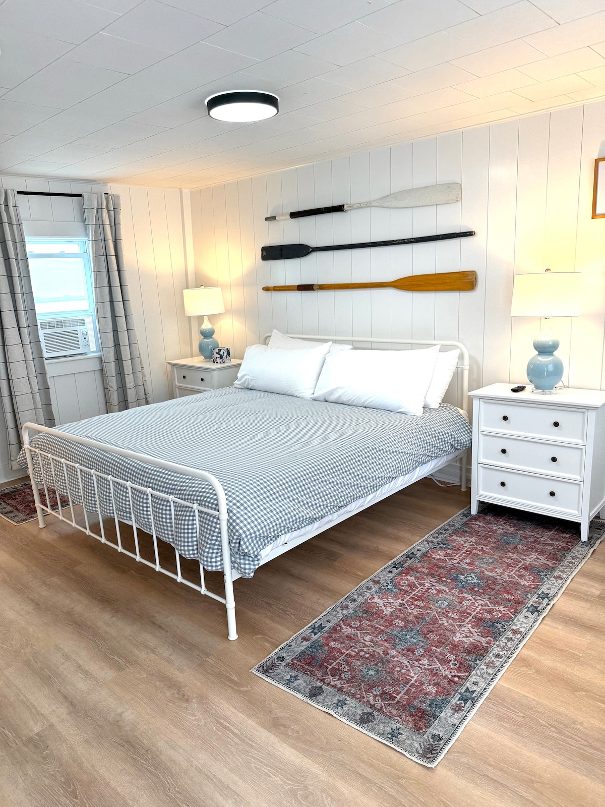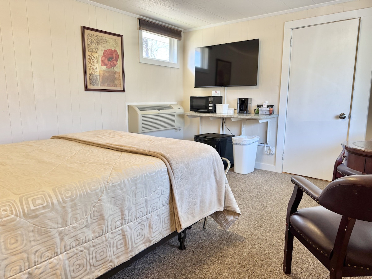 **NEWLY RENOVATED** This comfortable king room features a full bathroom, dedicated parking, and amenities including a microwave, refrigerator, free wi-fi, and a Smart-TV. Also included is a large common greenspace with lawn chairs, propane grills, and a private dog-park. An ocean beach, several restaurants, a general store, and a specialty wine and cheese shop are within easy walking distance.