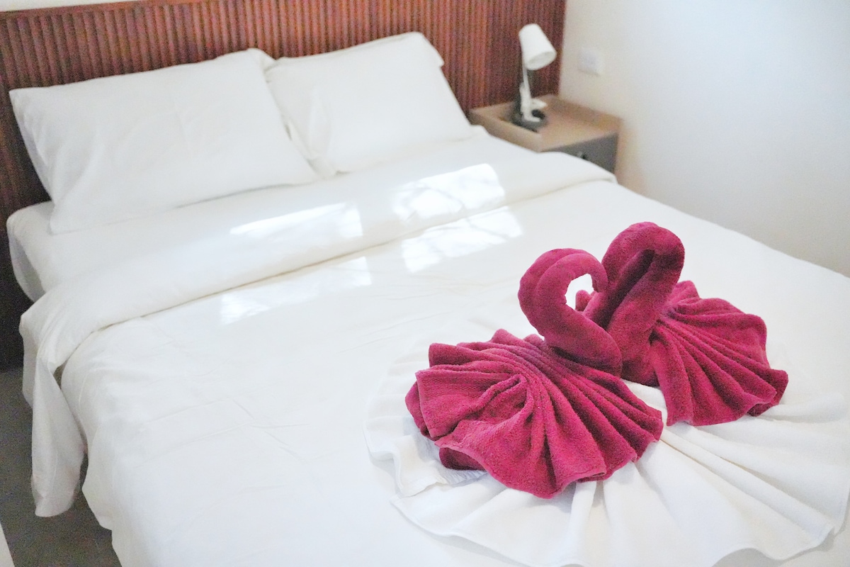 Relax at the guesthouse "Blue of Nature" near Chiang Mai City. In a peaceful village and built in 2023, this fresh, modern space is behind the main house, enveloped by greenery. It's brand new with bright windows, a cozy king bed, a small kitchen with essentials, and a clean bathroom. Enjoy amenities like TV, A/C, and fast internet. It's near the Royal Park Rajapruek. Enjoy made-in-order Thai meals from our chef with own organic garden herbs.