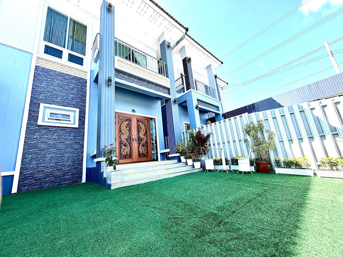 Relax at the guesthouse "Blue of Nature" near Chiang Mai City. In a peaceful village and built in 2023, this fresh, modern space is behind the main house, enveloped by greenery. It's brand new with bright windows, a cozy king bed, a small kitchen with essentials, and a clean bathroom. Enjoy amenities like TV, A/C, and fast internet. It's near the Royal Park Rajapruek. Enjoy made-in-order Thai meals from our chef with own organic garden herbs.
