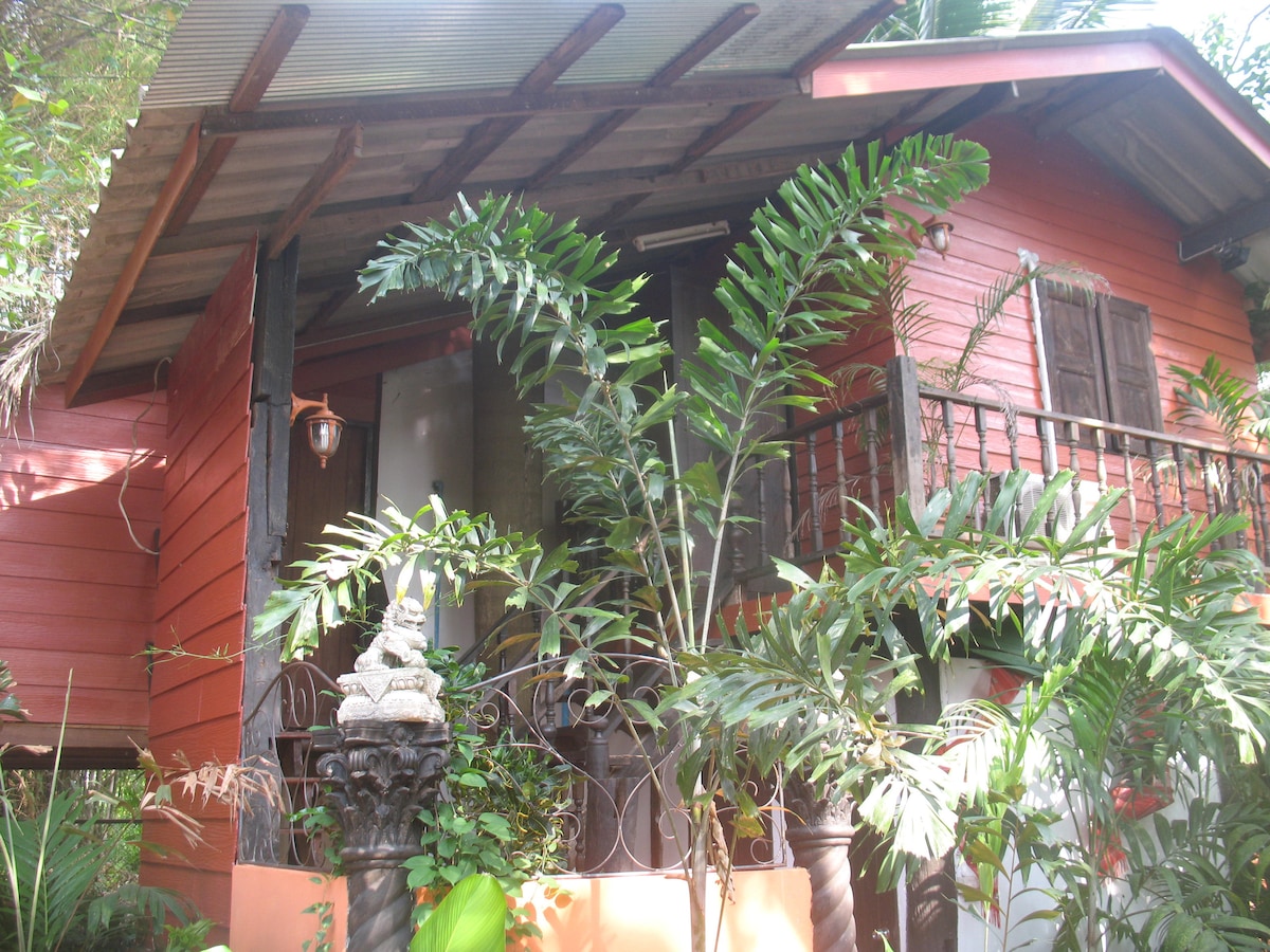 Our new wooden guest house refurbished from old rice barn on stilts. Features a full kitchen downstairs. Main floor has a/c and a hot water shower. The balcony overlooks groves of bamboo beside a creek and rice fields. Great Thai and western food close by along with coffee shops, fruit vendors and one of Thailands famous handicraft villages. Please check out my other guest houses this is one of 6 in total on the property creating a small wooden village set in a beautiful garden setting.