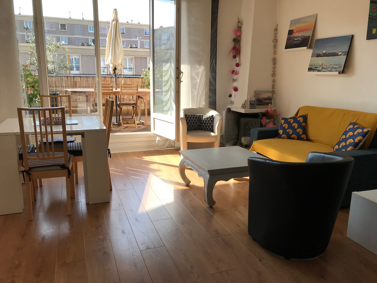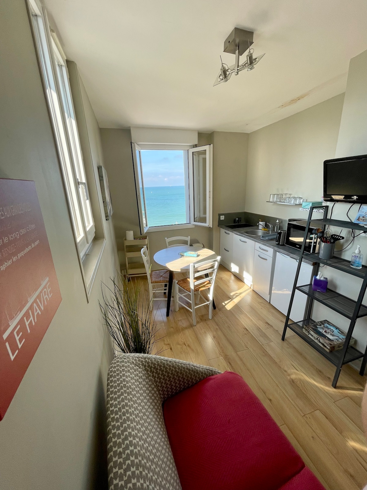 Plage 3min à pied. Pied-à-terre idéal pour votre séjour au Havre, professionnel ou loisirs: appart lumineux 55 m² , balcon plein Ouest, 4ème étage sans ascenseur Draps, serviettes & lit fait à l'arrivée, wifi fibre, cuisine équipée, chambre (lit 160) bureau/grandeTV, SDB douche à l'italienne baignoire double vasques & WC. Parking ind. Les Halles 5min: tous commerces & restauration. Super U, boulangerie & presse 1min Bus, tram & trottinettes électriques à proximité. Tram direct Plage/Gare: 7min