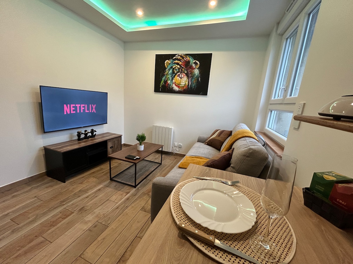 Studio 20m2 entièrement rénové, tout équipé. Le studio : - Le coin salon: canapé convertible (140cm x 200cm), télévision led connectée, plafond équipé d’un bandeau led et d’une enceinte Bluetooth encastrée. - Le coin cuisine: four, plaque de cuisson double, micro-ondes, réfrigérateur, cafetière Senseo. Service vaisselle complet et ustensiles de cuisine (poêles, casseroles…). La salle de bain: Douche italienne, dressing et sèche serviette. Drap, couverture, oreillers, serviette de bain fourni.