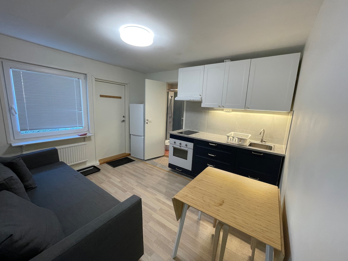 Fräsch etta på 34 välplanerade kvm i lugnt område, med mysiga restauranger, mataffärer och naturen inpå knuten! 2min promenad till pendeln och på 20min är du på Centralstation. Rymlig balkong med utsikt över parken, lekplats utanför dörren. Billig parkering med Parkster. Lägenheten har alla bekvämligheter såsom micro, kombimaskin och diskmaskin, allt nytt! Sovalkov med ny 140 säng rymmer 2 personer, öppen planlösning med en soffa som också går att bädda om så önskas.