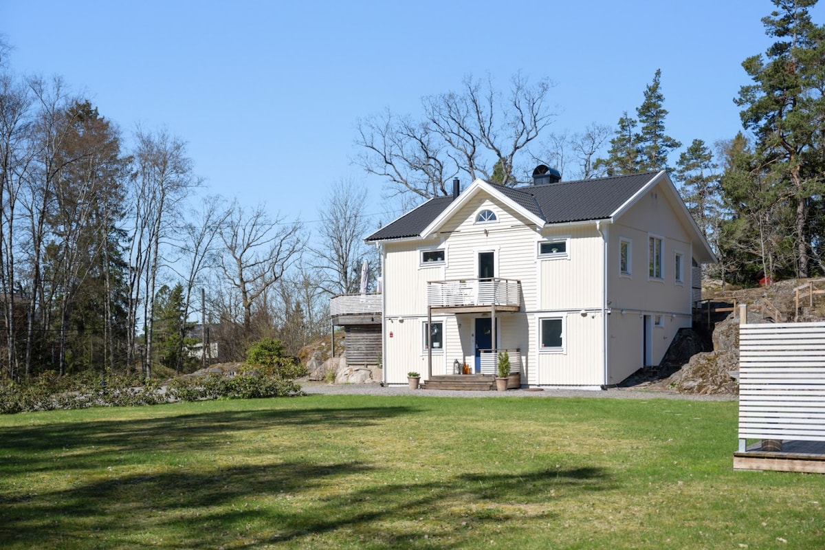 House by the sea on a jetty👍Enjoy the hot tub and wood-burning sauna. Fantastic outdoor environment. Modern and fully equipped house, tastefully decorated. Perfect experience for those who want to have a relaxing and beautiful time on the water🌞 If you want to be active: canoe, hike in the nearby national park, go for a run or go boating. All this just 30 minutes from Stockholm! Imagine spending a few days or weeks in this environment 😀 - All space is privately available to you as guests.