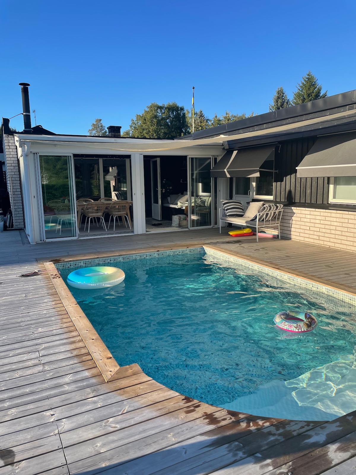 Skapa nya minnen i detta unika , lyxiga och familjevänliga boende. Vårt hem längtar efter en familj som vill njuta av en underbar plats alla säsonger med öppna och sociala ytor. Här bor du med bästa söderläge med sol hela dagen , pool (sommar) och jacuzzi (vinter) , stor gräsmatta på sjötomt med tillgång till brygga, trampolin, båt för fiske, kajaker mm. Avskilt men endast 20 min från Stockholm C dit du enkelt kommer med buss bara några minuter från huset. Närhet till Tyresta naturreservat!