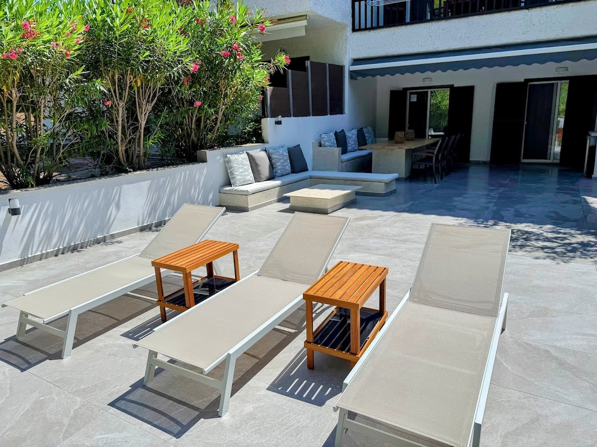 Exklusives Ferienhaus, stilvoll und modern eingerichtet für ein komfortables wohnen für die gesamte Familie und Freunde. Im Erdgeschoss befindet sich das loftartige Wohnzimmer mit Einbauküche und großem Esstisch sowie ein Badezimmer. Im oberen Geschoss befinden sich 5 Schlafzimmer mit zwei Badezimmern und 6 Terrassen. Im Untergeschoss gibt es eine Duschkabine, ein WC, eine Bar und ein weiteres Wohnzimmer. Der Garten beinhaltet einen Swimmingpool, einen Pavillon und einen Grillplatz