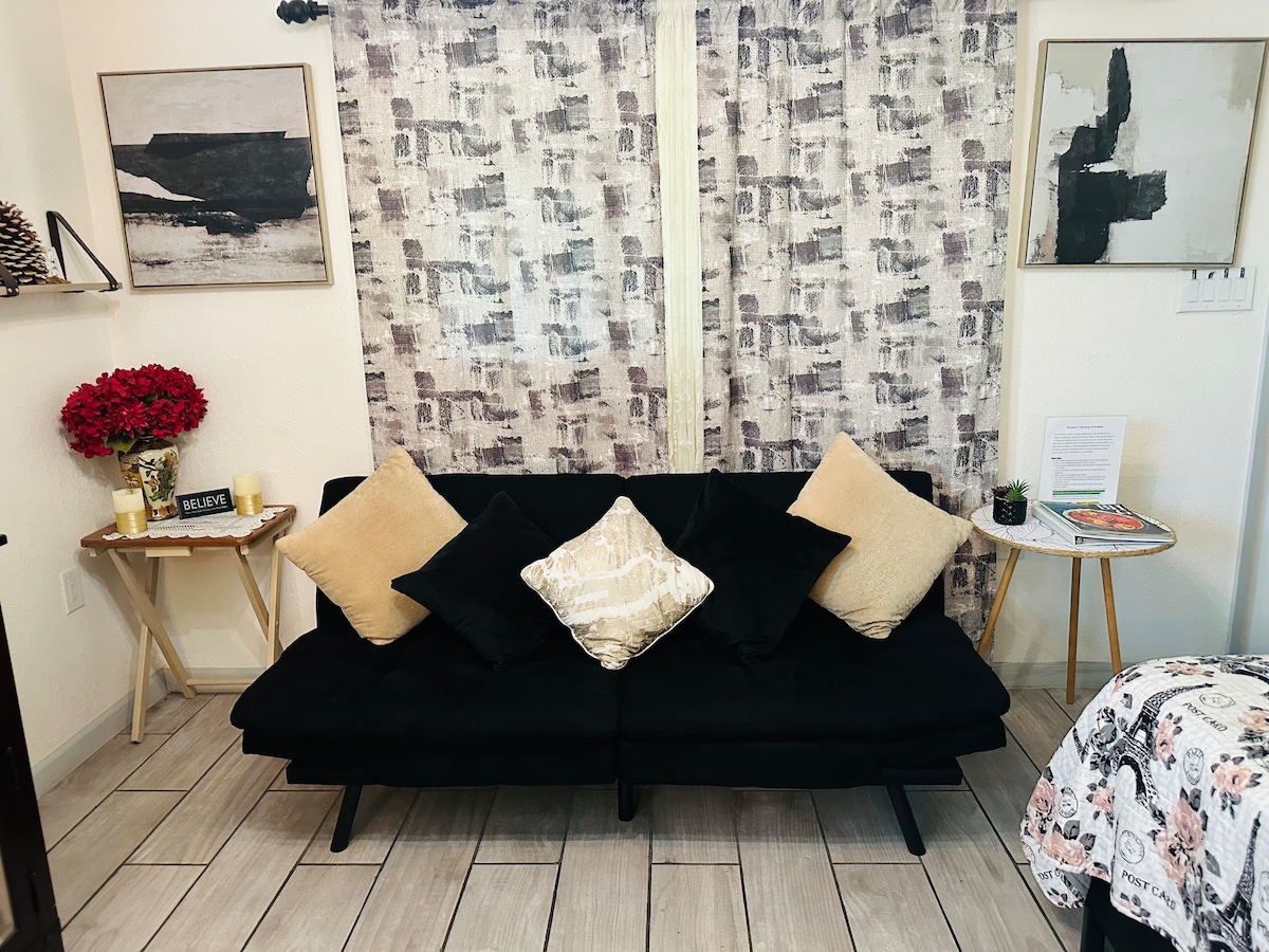 You are booking for 1 BEDROOM ONLY (1-2 guests ONLY) This is a new modern style home with 1 bedroom, a private entrance, 1 restroom/shower and a small kitchen. Our neighbor is very safe and quiet. The rental is a house within a house, but blocked by a locked door for your privacy. Small Kitchen has: -Microwave -Mini Fridge -Coffee Maker -Toaster -Kettle DOES NOT include: washer/dryer or stove/oven 2 Bedroom option available for this same guesthouse, different listing under my name