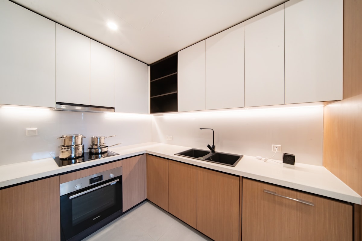 The apartment just opened in June 2025. It is meticulously designed in a mid-century style blended with Vietnamese cultural elements. Most importantly, it’s located right in Hoan Kiem District—just a 5-minute walk to the famous Train Street coffee check-in spot and another 5 minutes to Hanoi’s Old Quarter. Enjoy a stylish experience at this centrally-located place.