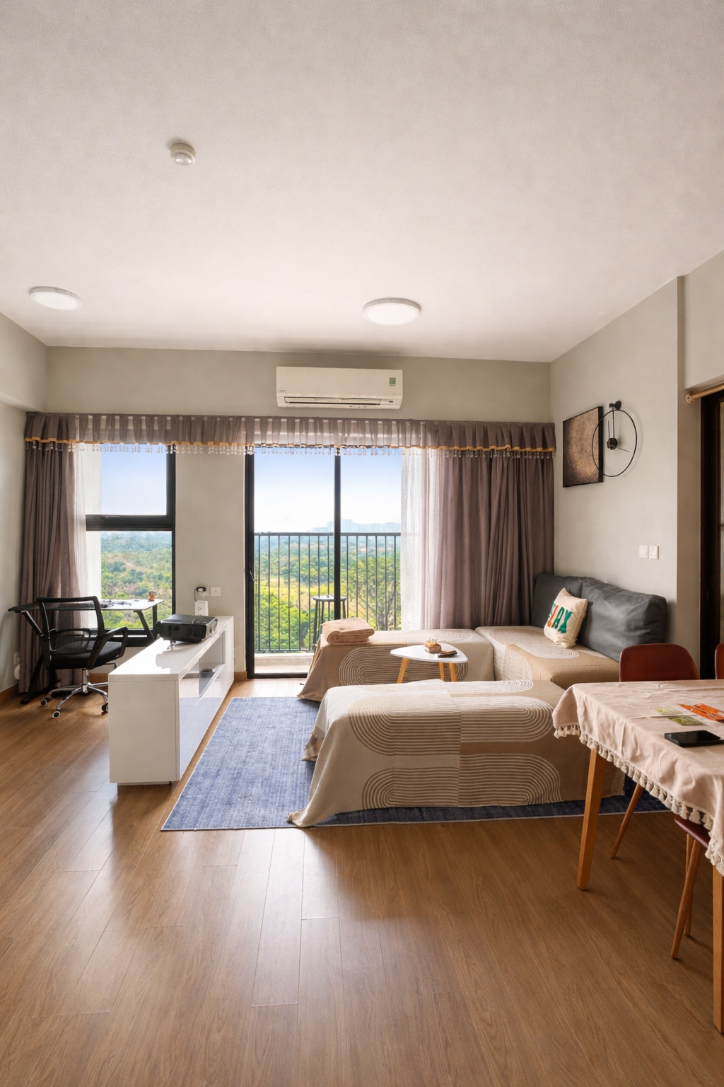 Sol Forest building was designed by the renowned international architecture firm Dewan Architects + Engineers (Dubai), famous for its Vertical Forest concept. The design creates a unique green space with elevated tropical gardens, bringing a harmonious balance between architecture and nature. The apartment is located on the 30th floor, overlooking the Vạn Tuế residential area, with open and refreshing views of the Haven and Vạn Tuế swimming pools. The homestay belongs to Cui Homestay Ecopark.
