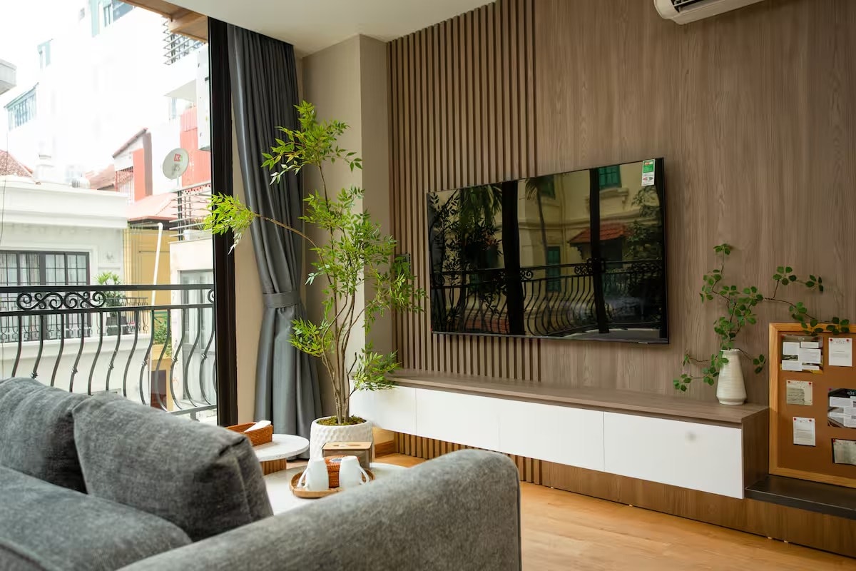 A cozy studio with natural wood design and a private open-air balcony filled with greenery. It's on the 4th floor of a building located in a safe and quiet neighborhood near Trúc Bạch Lake. Perfect for solo travelers or couples seeking a peaceful retreat. Mrs. Nghĩa is available right at the building to warmly assist you offline every day from 9:00 AM to 4:30 PM.