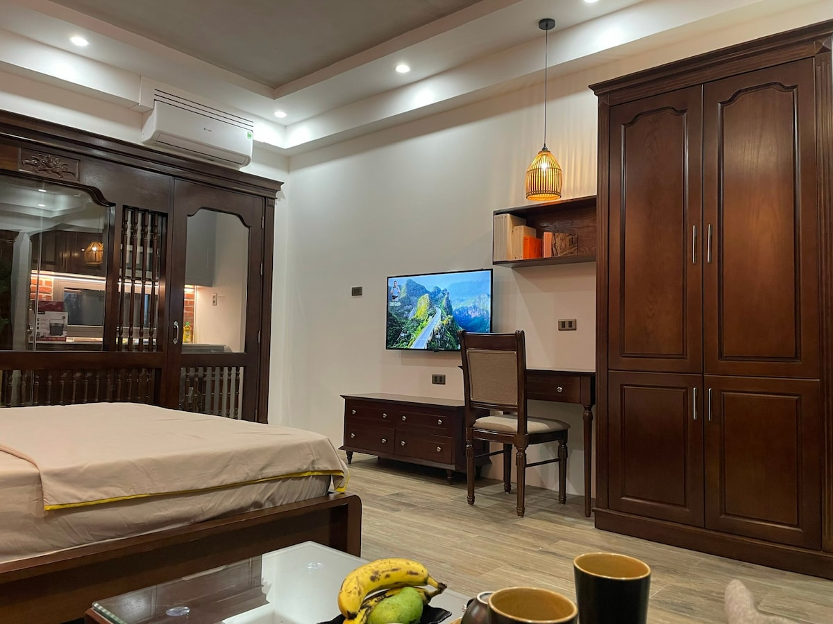 Relax in a peaceful apartment with stunning West Lake views on tranquil Yen Phu Peninsula. The spacious living room has a large, comfortable sofa for lounging or sleeping. A functional kitchenette with a washer/dryer ensures convenience. The bedroom includes AC, a flat-screen TV, and a workspace ideal for work or relaxation. Set in a low-traffic area, it offers a peaceful escape from the city buzz. The apartment perfectly combines the beauty of the lake with proximity to Hanoi’s dynamic streets.