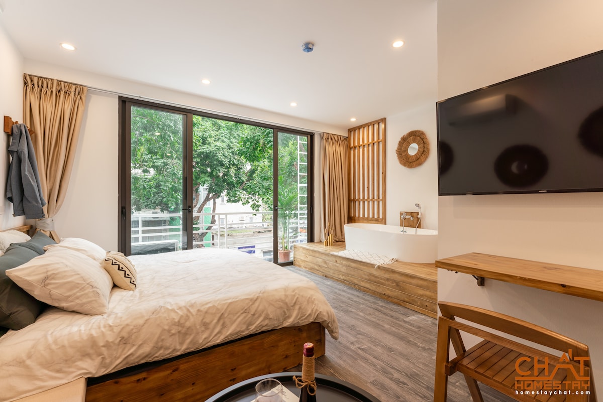 A luminous retreat where sunlight spills through wide windows and the city hum softens into a lullaby. The Highlights: Space: Rare 50m² layout with a private balcony & relaxing bathtub. Location: Tucked on the leafy, prestigious Lý Nam Đế street—Hanoi’s peaceful "Military Quarter." Convenience: 3-min walk to Train Street & 24/7 Food Street. Vibe: High-floor views, sun-drenched, and absolute peace