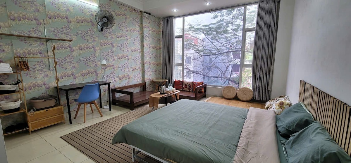 🌿 Bright Private Room | Ensuite | Shared Kitchen | Long-term Friendly Stay in a bright, airy room with high ceilings and large windows, located in a quiet, car-accessible alley in Hanoi. Has a private ensuite bathroom for your comfort and privacy. Enjoy our spacious shared kitchen on the 7th floor—perfect for cooking and dining without bringing smells or insects into your room. Amenities include washing machine & dryer, clean & comfortable living space ideal for both short and long stays.