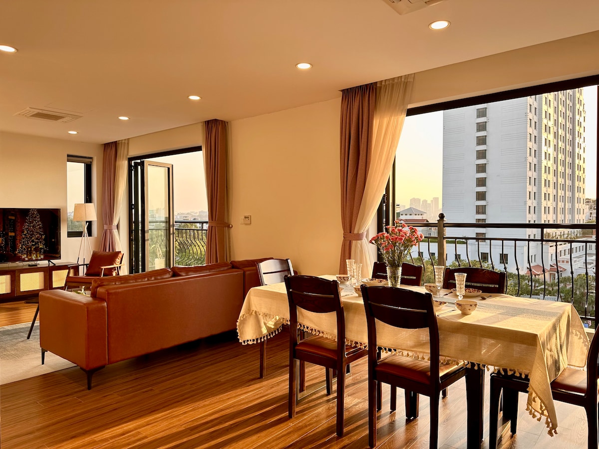 Spacious 150sqm 3-bedroom apartment in Tay Ho, ideal for families and groups, offering: - Bright living space, full kitchen, and free gym access included - The most quiet & peaceful place in Hanoi - 5 min walks to multiple convenience stores - Just 5 mins (motobike/car) to Lotte Shopping Centre with entertainment, shopping & food court - Just 15 mins to central of Hanoi - Free morning coffee & snack - Offering full service: Airport pick up, room service, booking trips