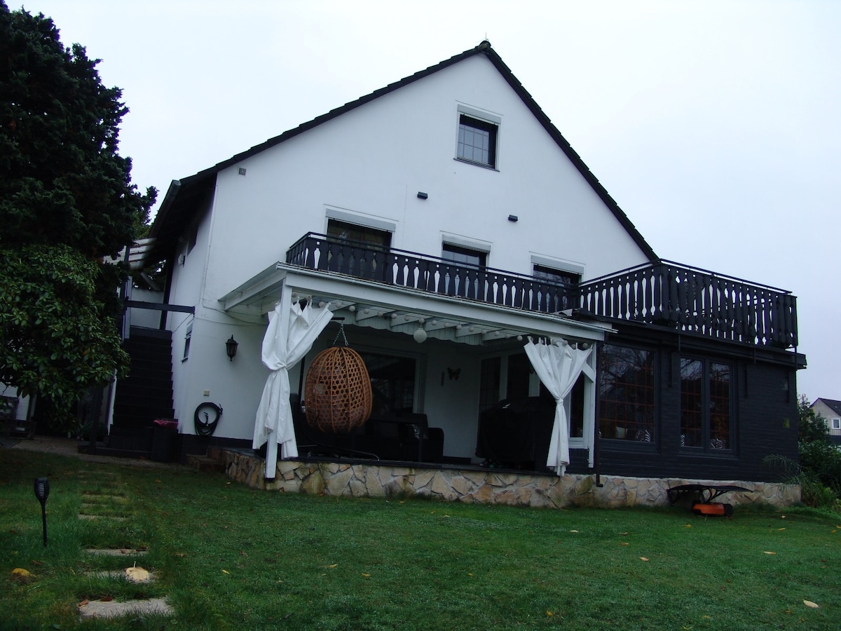 Das stilvolle 4-Giebel-Nurdachhaus in Fachwerkbauweise ist ideal für Gruppenreisen oder Firmenfreizeiten. Ruhige Dorfrandlage im Grünen auf einem Obsthof. Für entspanntes Wohnen und /oder Arbeiten sorgen: - die geräumige Wohndiele mit Essbereich, Kamin, Hausbar und Zugang zu Terrasse/Garten - 2 Loggias im Obergeschoss - Sauna, Crosstrainer - Komfortables Arbeits-/Besprechungszimmer. Internet via Glasfaser - 5 Schlafräume, 2 Bäder, Küche, Gäste-WC - Speisekammer und Hauswirtschaftsraum