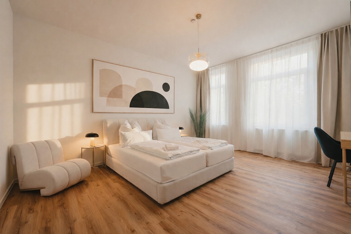 Welcome to your stylish City Suite in the heart of Hildesheim! On 95 sqm, you’ll find two quiet bedrooms with comfortable king-size beds, a fully equipped kitchen with a dining area, and a Nespresso machine to start your day right. Modern design and a smart layout make it ideal for families, friends, or business travelers. Quiet yet central – with high-speed WiFi and a private parking space.