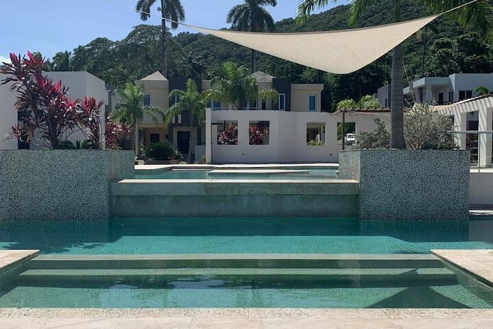 Modern space with 3 BR, 3 BA, Sleeps 5 It is located 20 mins from the airport. Gated Complex with 24-hour security, gym, beautiful outdoor infinity swimming pool with waterfall, and kids play area with treehouse. Cradled by the ocean and mountains, it is ideal for couples, small groups, business travelers, and families and has easy wheelchair access to the ground floor. It is just 5 to 10 minutes away from shopping and restaurants and 15 minutes to the Hipstrip and beautiful Doctors Cave Beach.