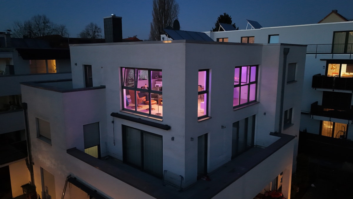 Air-conditioned, modern apartment/loft in Hannover-Langenhagen. 🌟 📐 Spacious 958 ft² (89 m²) for up to 5 guests with a fantastic kitchen, rooftop terraces and year-round heated whirlpool. Hugh windows provide plenty of natural light in the open-concept living area. 📍 Very central yet quiet: 8 min to the airport and 20 min to the trade fair. 🛒 Everything (shopping, cinema, restaurants, doctors) in walking distance or easily reachable by public transport (airport, trade fair, city center).