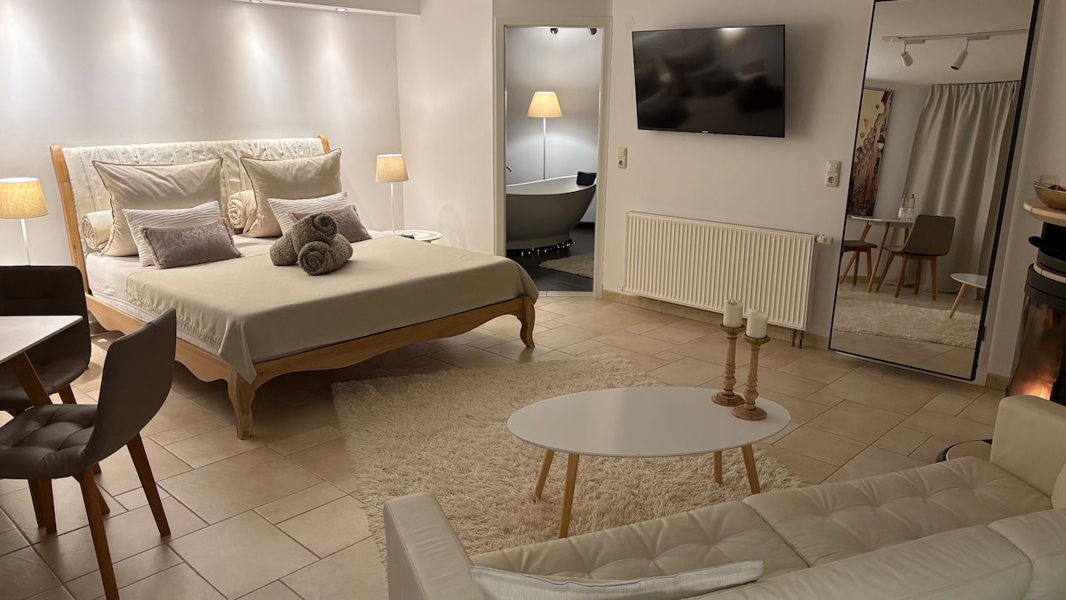 Our Romantic Wooden Lodge has been created with an eye for detail to offer you a warm and cosy atmosphere in a wonderful woodland surrounding. Depending on the season you have the choice to swim, to enjoy the sauna, or just chill sitting by the cosy wood burning stove in the lodge. Hiking trails start directly behind the BLH and a restaurant with a beer garden is 800m behind the BLH.