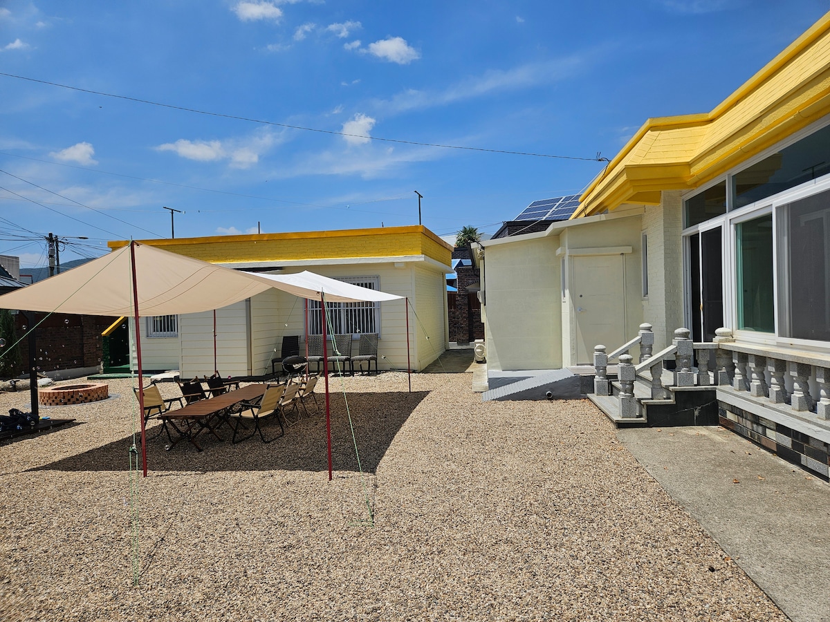 조용한 단독주택가에 위치한 단독주택 별채입니다. 넓은 잔디마당 견사에 2마리의 작은 강아지와 연못 잉어들이 살고있어요~! 잔디마당에서 바베큐하시고, 지하노래방에서 재밌게 놀수있어요.(냉난방기 갖추어져 있어요.) 아침풍경이 참 예뻐요. 조용하고 평화로운 마당 테이블에서 자연을 만끽하며 커피한잔. . . 여러가지 꽃들이 계속해서 피고지고 한답니다. 건물뒤편 넓은논에는 계절따라 초록에서 노랗게 바뀌는 벼이삭도 볼만한 풍경이랍니다^^ *체크인 - 오후4시 (짐 보관은 아침부터가능) *체크아웃 - 낮12시 *바베큐 숯불 - 2만원(비가와도 바람만 심하게불지않으면 가능하고,겨울에는 바람가림막과 난로 피워드립니다.) *지하노래방 -이용규칙 -요금 : 1만원 무제한 (매일 신곡업데이트)/금연구역/술,음료,음식물반입금지 입니다. *정수기,에어컨,티비,전기쿡탑,전기주전자,원두커피머신,다리미, 전자렌지,세탁기,토스트기, 냉장고,전기밥솥, 샴푸, 린스, 바디워시, 수건 제공해드립니다.