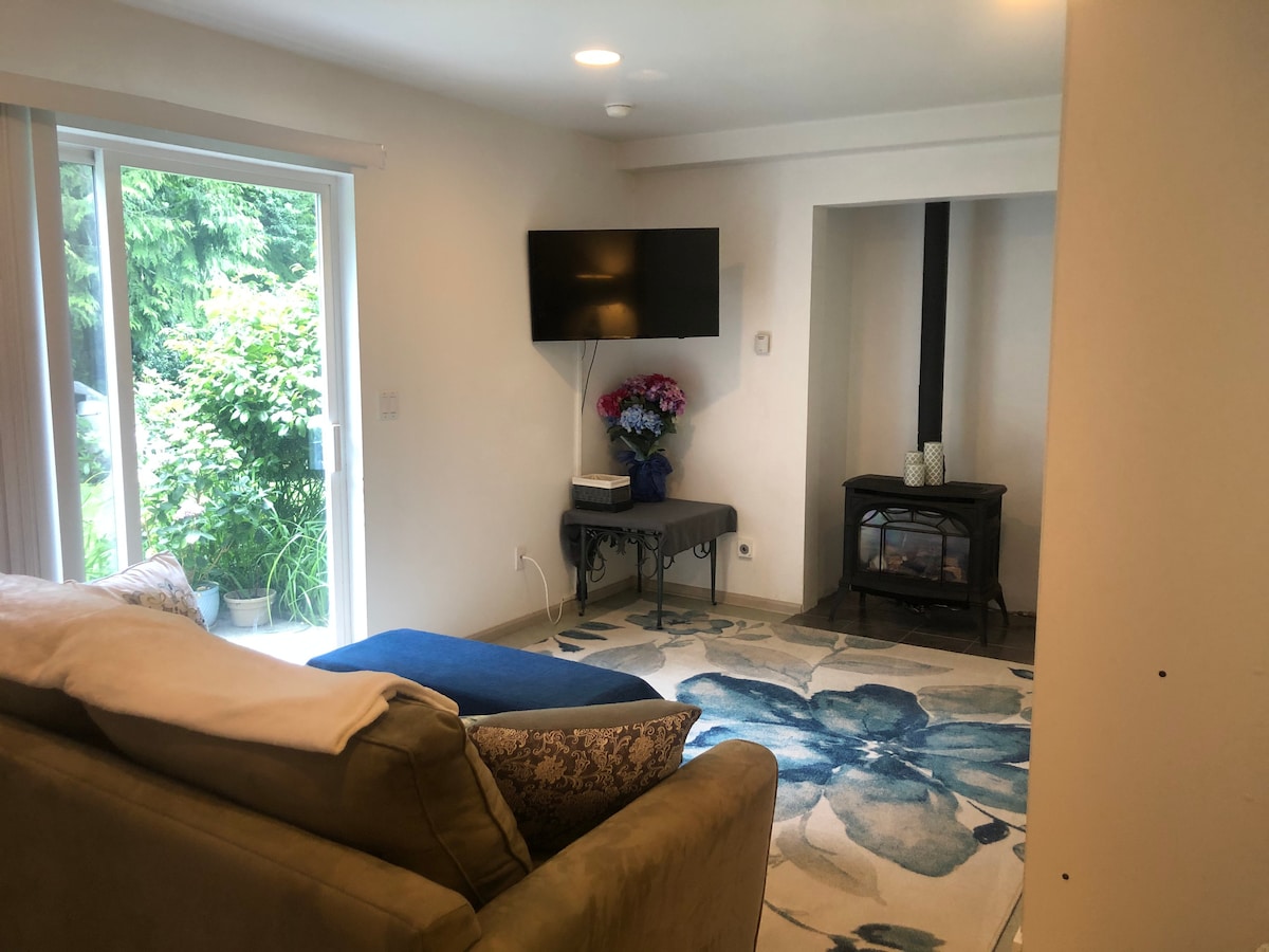 Welcome to a place of peace, restoration and comfort. With its own private entrance, you will have the downstairs apartment in our gorgeous island home, surrounded by massive cedar and fir trees, lush landscaping, and a beautiful, large pond. Wander down to the pond, sit, meditate, absorb the pervasive peace of this property. Apartment amenities include washer, dryer, wi-fi, cable TV, fully-appointed kitchen. We also have a PacnPlay with sheet, if you have an infant/baby up to 2 years.