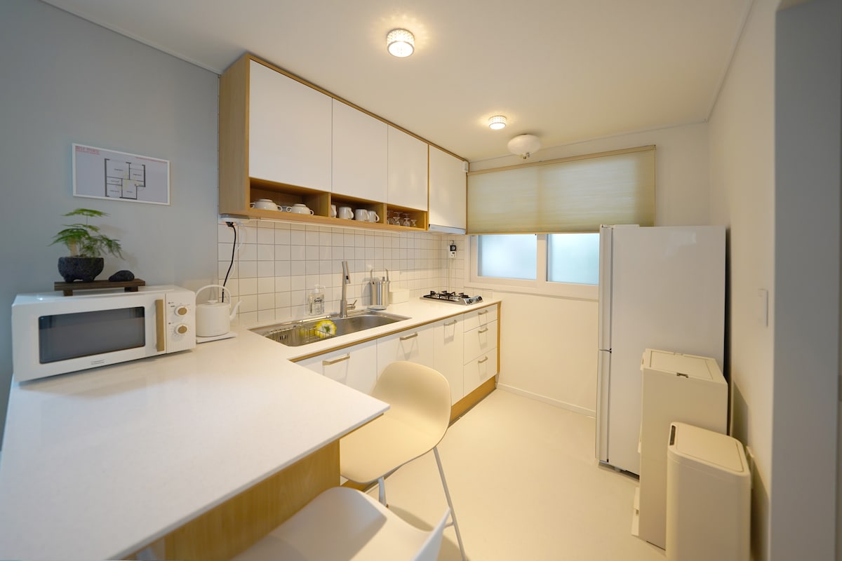 [house 204] - Hongik University Station is a 3-5 minute walk away and close to the main street. - The building has a 12-person elevator that can easily move large bags. - All premium quality bedding (bed sheets, duvet covers, pillow covers) are always washed as standard option for each guest. - Guests control the temperature of the air conditioner in the summer and the boiler in the winter directly from their rooms. - The building was built in 2023 and is clean.