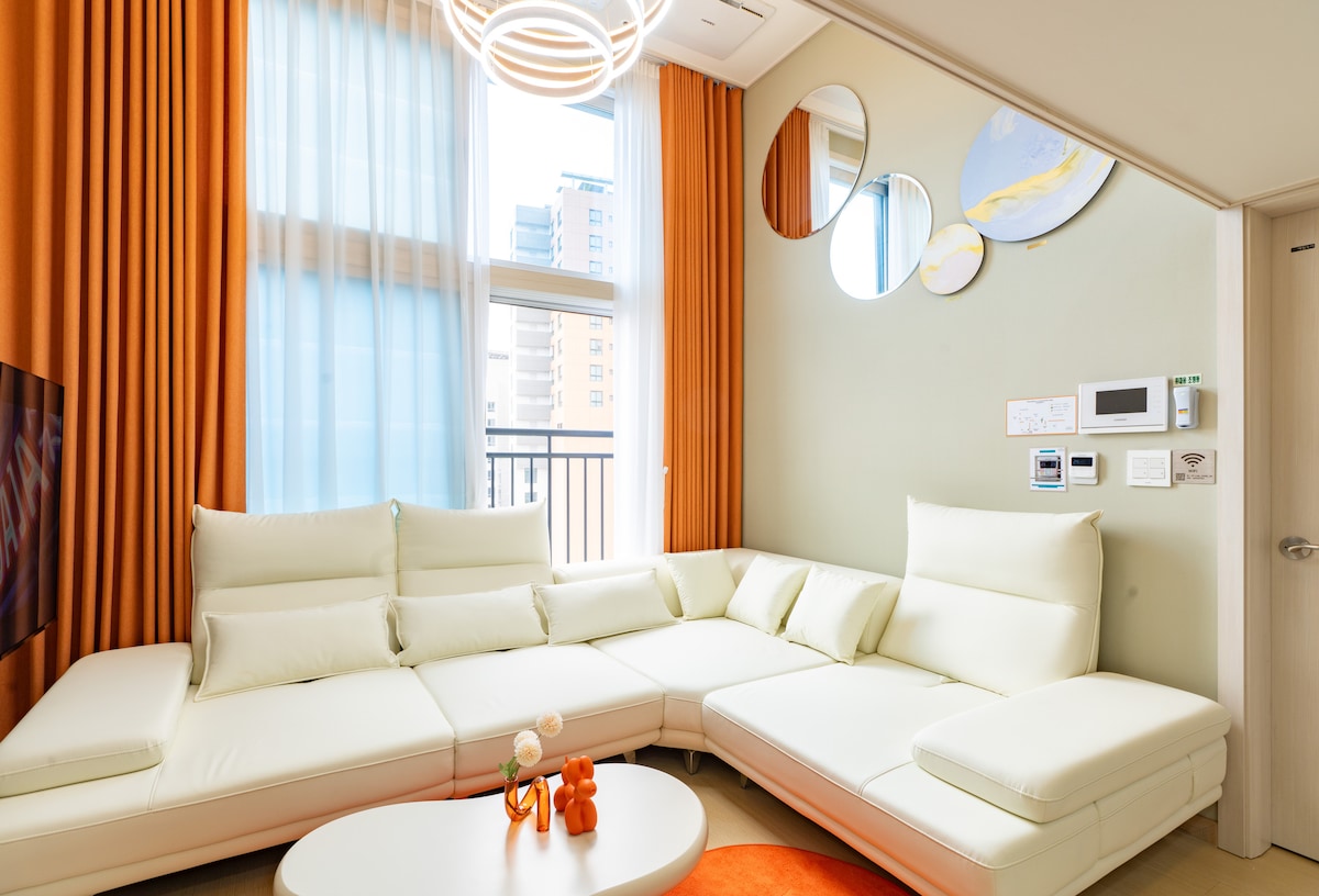 距离弘大新村5分钟,儿童友好型,2楼大床,PS5,复式电影院,婴儿车免费租赁