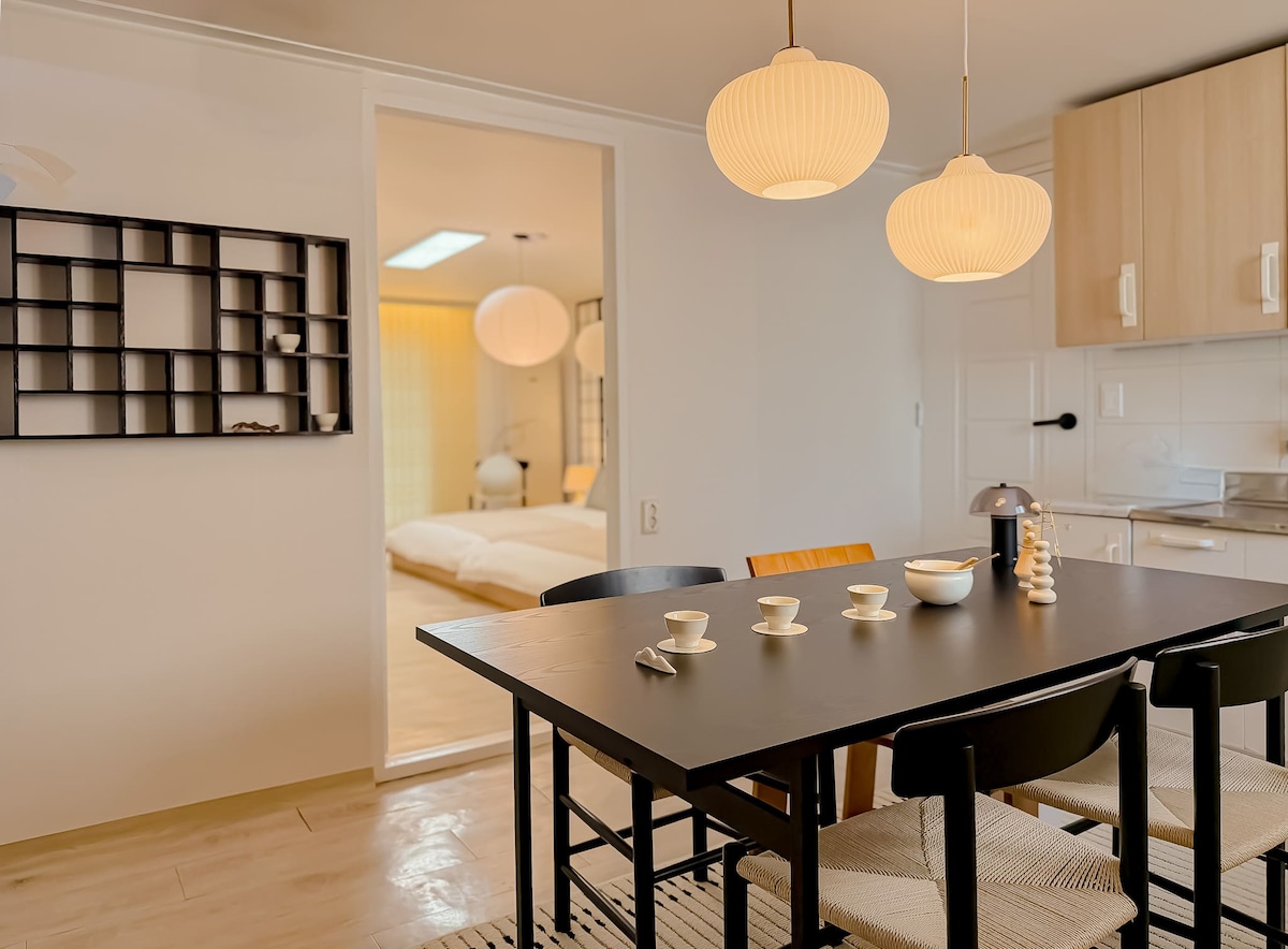 Black&Wood House Your Quiet Escape in Hapjeong A warm, minimal loft with black&wood design, soft mood lighting. Step inside and unwind in a calm corner of the city. 📺 Cozy Movie Room Relax on the soft sofa and enjoy Netflix with the projector. The gentle lighting makes it a perfect photo spot. 🌿 Han River, Local Spots A 10-minute walk to Han River Park. Surrounded by local cafés, bakeries, and pubs—ideal for exploring Hapjeong and Hongdae. A handmade local guide map is provided at check-in.
