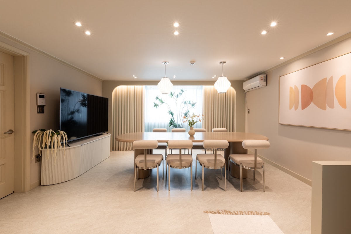 이 숙소는 최근에 새롭게 인테리어 한 아늑하고 화사한 스타일 넘치는 공간으로 온 가족과 함께 즐거운 시간을 보내기에 좋은 30평 집입니다. 리조트 느낌을 주는 거실에서 주방까지 넓은 공간으로 여러 명이 함께 머물기에 적합하며,부드러운 베이지와 화이트 컬러가 조화롭게 어우러져 따뜻하고 깔끔한 도시 중심부에 위치한 숙소입니다. 홍대와 한강까지는 차로 5분 내로 이동 가능! 홍대거리 도보 8분, 망원시장 도보 5분, 한강 도보 8분. 숙소 내에는 75인치 초대형 스마트 티비와 3미터의 테이블은 물론 세탁기와 건조기까지 모두 구비 되어있습니다 방은 총 3개이며, 고급 매트리스와 호텔식 베딩으로 셋팅하였습니다. 방 1- 퀸 침대 2개+ 화장대, 서랍장+ 행거 방 2- 퀸 침대 1개+ 화장대, 서랍장 방 3- 퀸 침대1개,슈퍼싱글 침대 1개+ 행거 깔끔한 욕실 2개 숙소에서 도보로 합정,홍대, 연트럴파크,망원동 망리단길,한강을 두루 즐길 수 있는 멋진 공간입니다!!