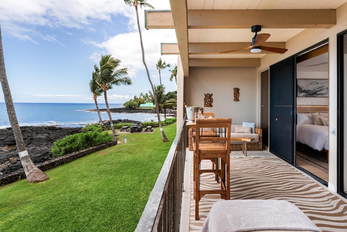 Right-on-the-ocean, newly renovated, spacious, upscale condo in a gated boutique complex. Unbelievable views from the lanai, living room and bedroom. Close to everything! 1-2 blocks to Honl's beach, farmers market, restaurants, bars, and shops in Kailua Village. New king bed and queen sleeper sofa with memory foam mattress for up to 4 guests. Heated, ocean-front salt water pool with outdoor shower and community BBQ. Quiet; no noise from Ali'i Drive. Reserved parking spot. A/C. Elevator.