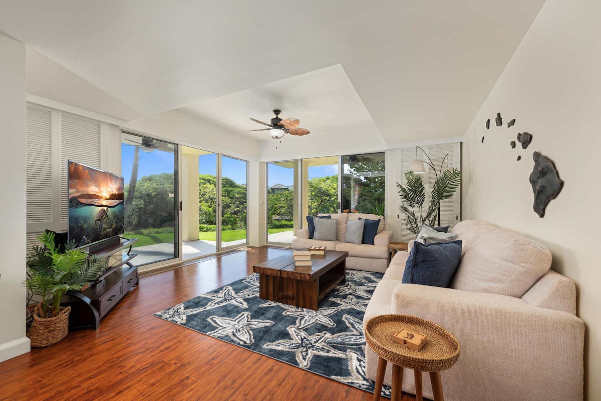 Enjoy your stay at this serene ground floor, remodeled in 2023, 1 bedroom 1 bath corner unit condominium in one of the best location of Waikoloa Beach Resort. * Lush tropical landscaping with ponds and waterfalls * Next to pool, tennis court, BBQ and fitness center * Walk to beach, shops, restaurants, entertainments and Grand Hilton * Free fast WiFi. Central A/C. Washer and dryer. * Spectrum Cable and Roku streaming TVs * Private Parking spot 50 yards from the front door