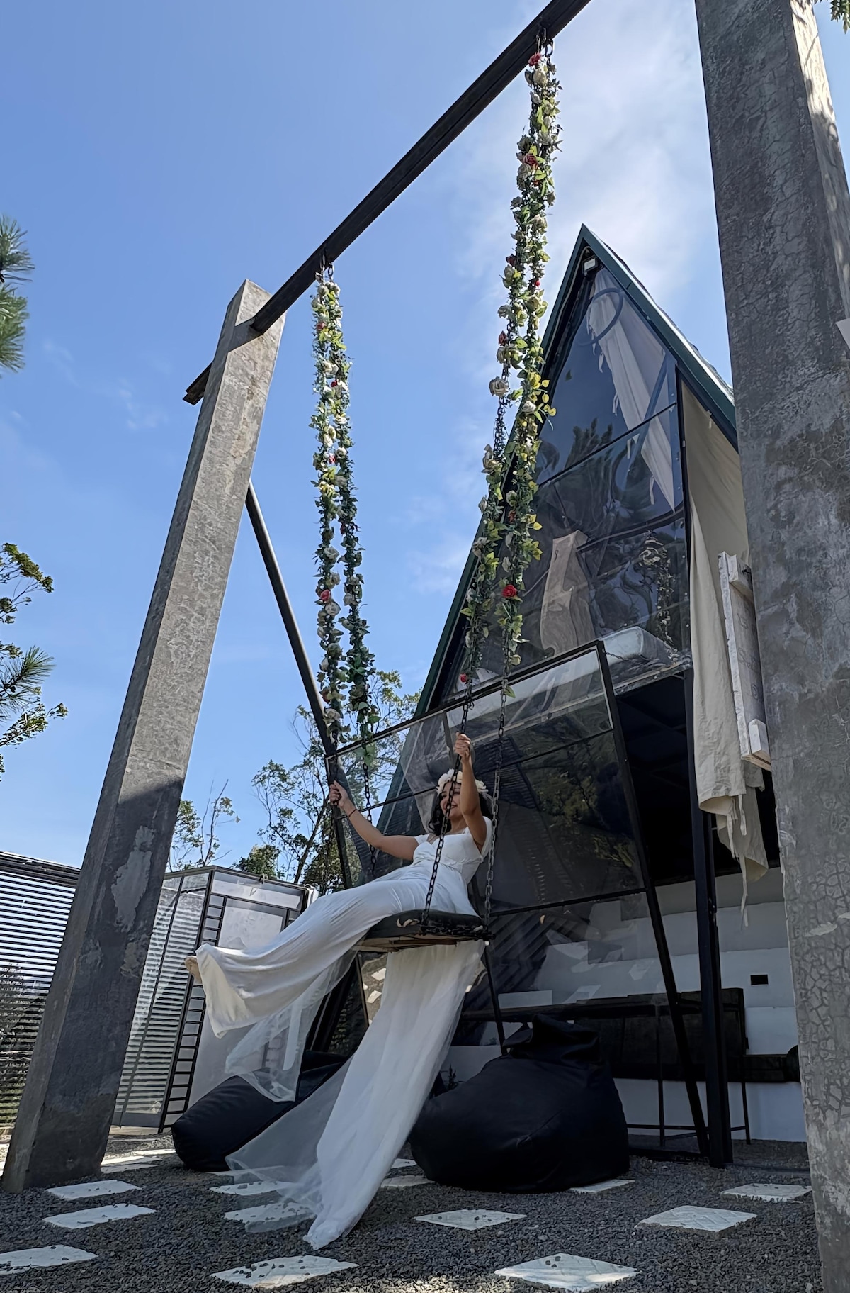 Welcome to Swingfinity, a unique A-frame cabin perched above the lush hills of Ella, overlooking the iconic Nine Arch Bridge. Designed for those who seek beauty, serenity, and a touch of adventure. Enjoy comfort and magic in every detail — from the cozy loft bed under the triangular roof to the open outdoor sitting area framed by mountain skies. 💫 Highlights: Giant swing, stunning views, and unique design. Just 200m from Nine Arch Bridge 2km from Ella town/Train Station/Cafés. 500m to Ravana