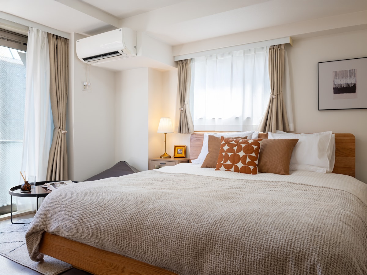 Peaceful stay one street off Meiji-dori’s cherry blossom avenue, with sakura-view cafés and restaurants 1–2 min away. Near the embassy district, Tokyo’s safest area, with English-friendly cafés and supermarkets. Morning: bakery 1 min away or breakfast café 5 min away. Night: Ebisu Yokocho, hidden bars, and diverse restaurants. Loved by Big Tech developers and digital nomads; the loft’s two doubles let even tall guests sleep lengthwise. 1 stop to Shibuya or Roppongi, tucked away for quiet work.